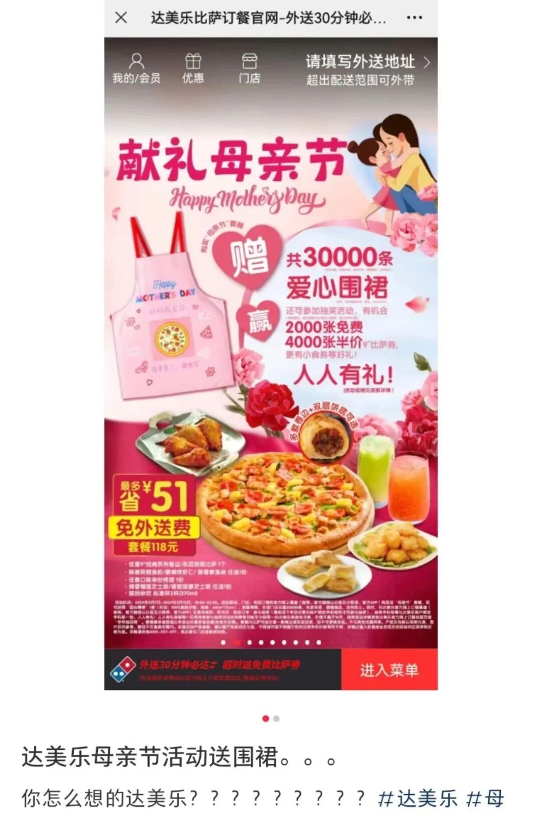 达美乐在海报中说,购买母亲节套餐,将送出3万条爱心围裙。令人忍不住吐槽,“达美乐,你是怎么想的。”