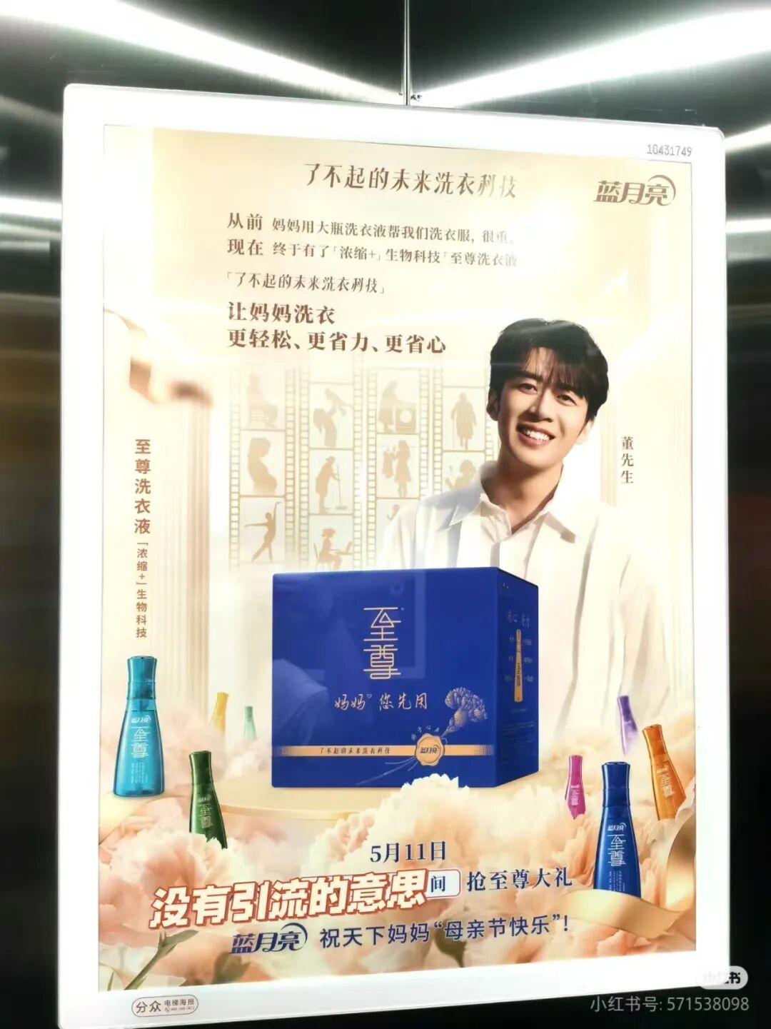 在今年母亲节的时候,为了推广“至尊洗衣液”产品并给直播间引流,蓝月亮投放了一批电梯广告。
