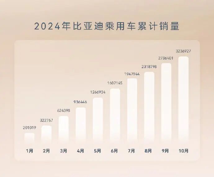 今年1-10月,比亚迪新能源汽车销量为325.05万辆,同比增长36.49%。