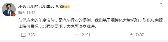 与供应商的年度议价,是汽车行业的管理,我们基于规模化大量采购,对供应商提出降价目标,非强制要求,大家可协商推进。