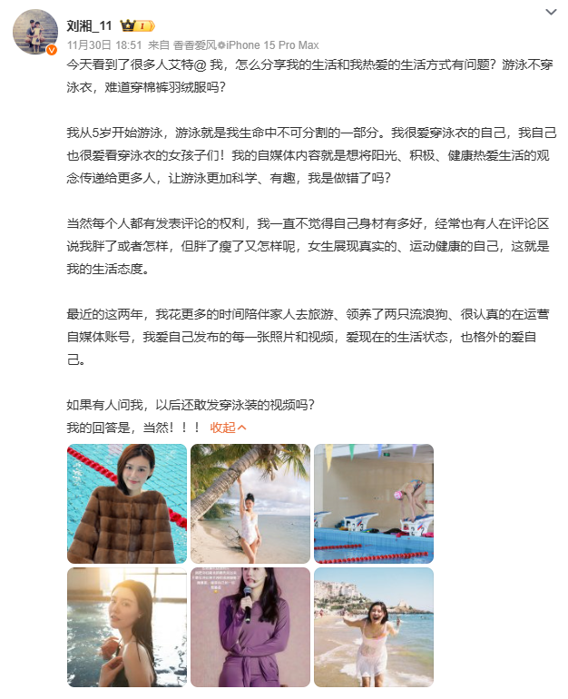 对此,刘湘在11月30日发视频回应称:游泳不穿泳衣,难道穿棉裤羽绒服?