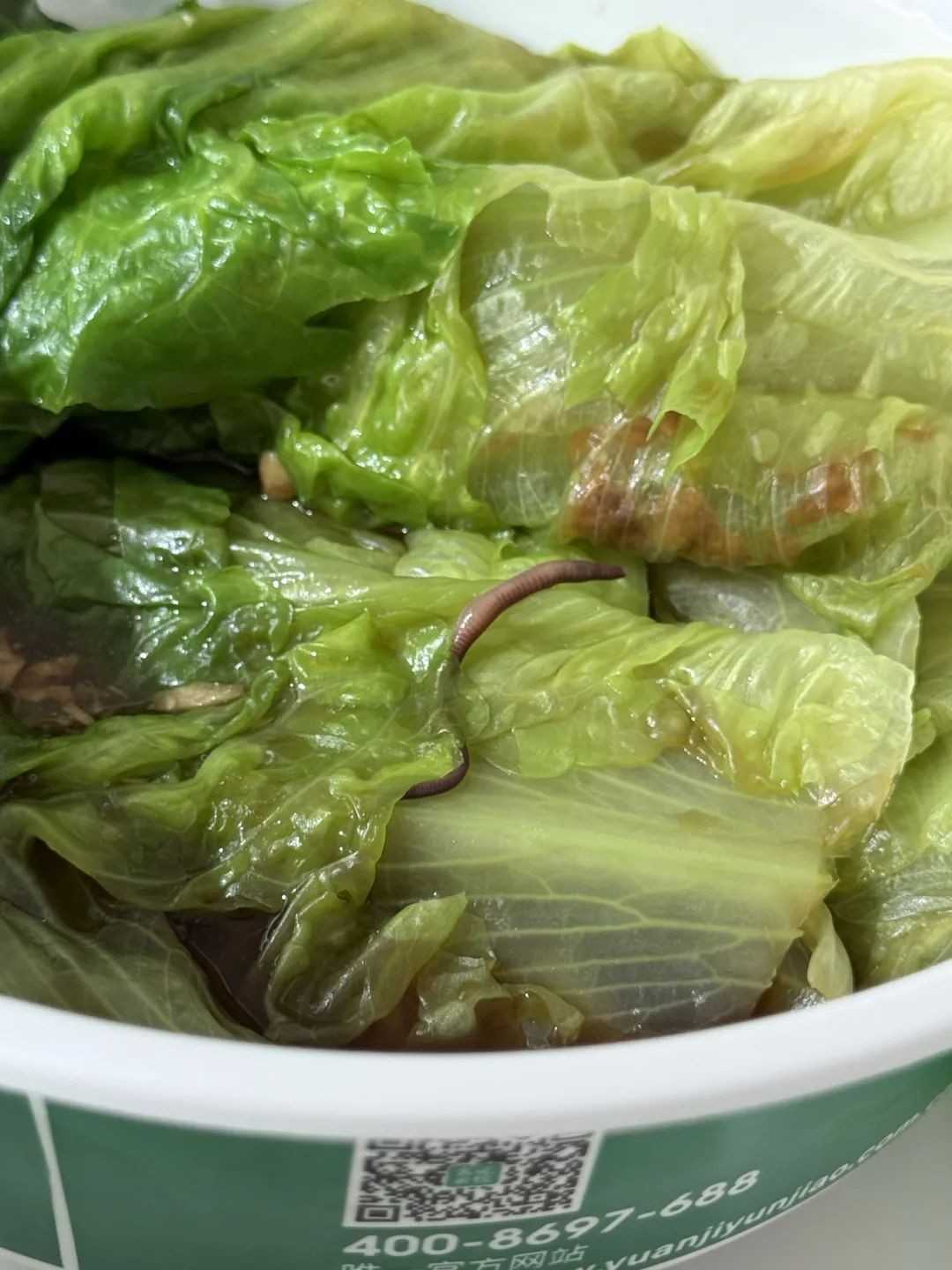 11月27日,有消费者在社交媒体上发帖反映,自己通过点餐平台下单的袁记云饺(丽晶国际店),在生菜叶中发现了一条完整的红褐色蚯蚓。