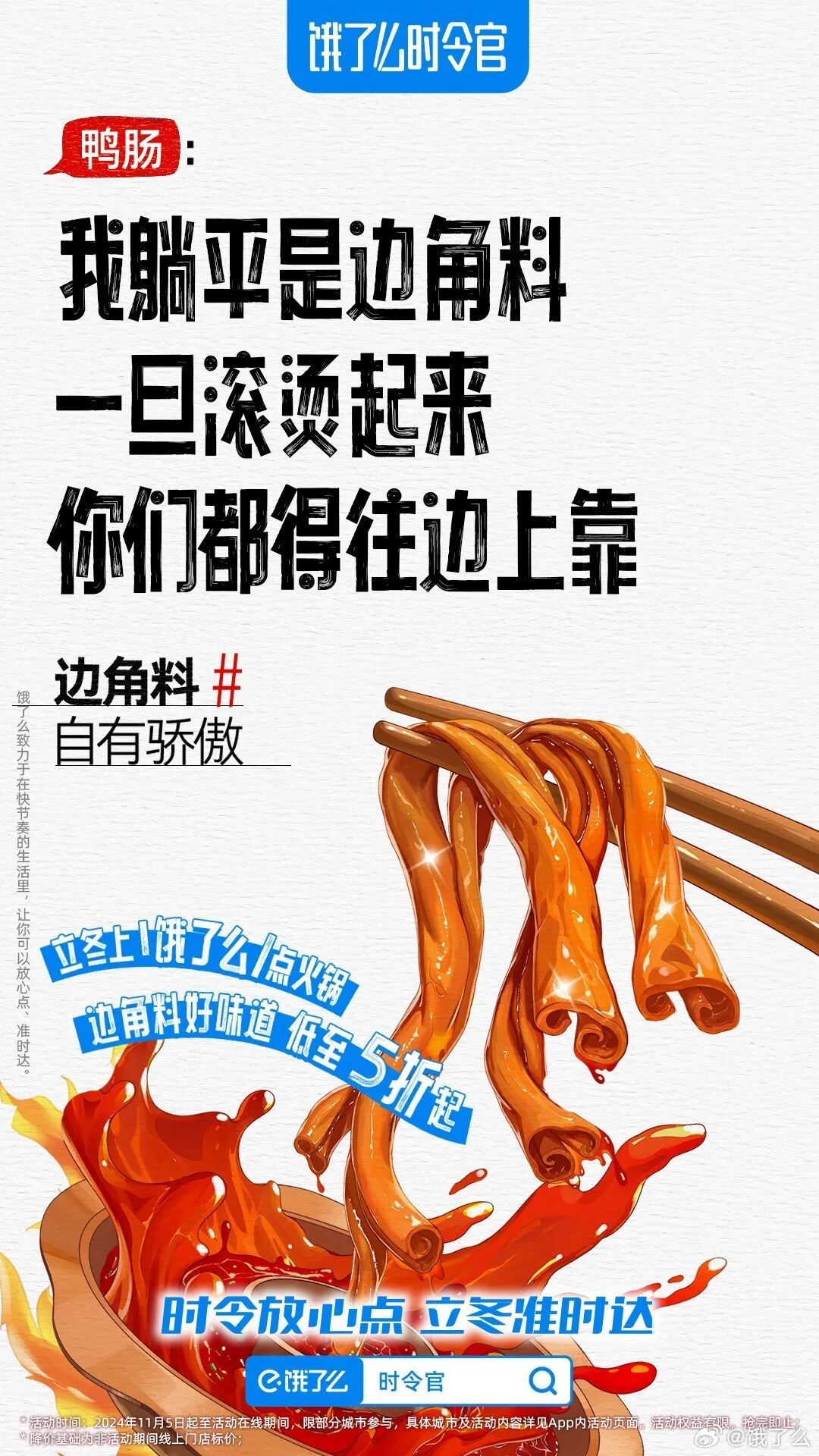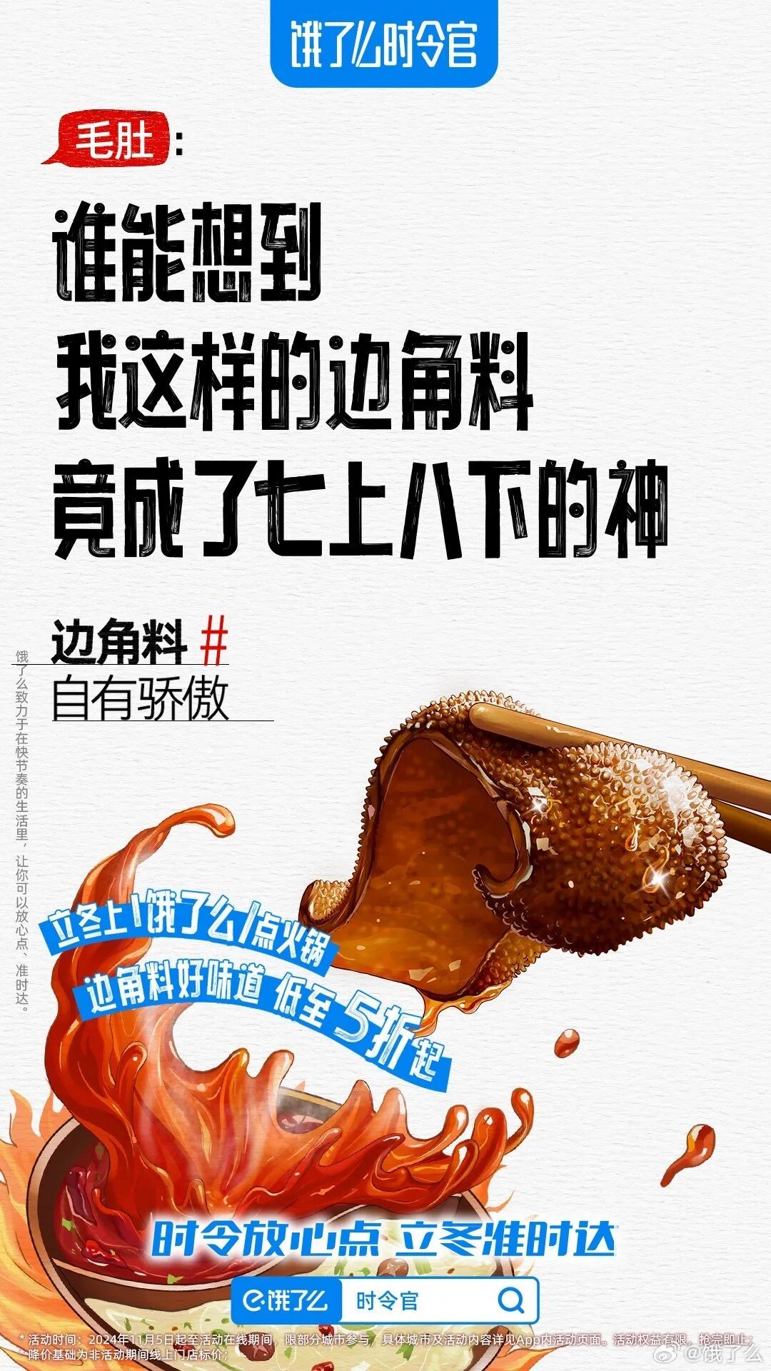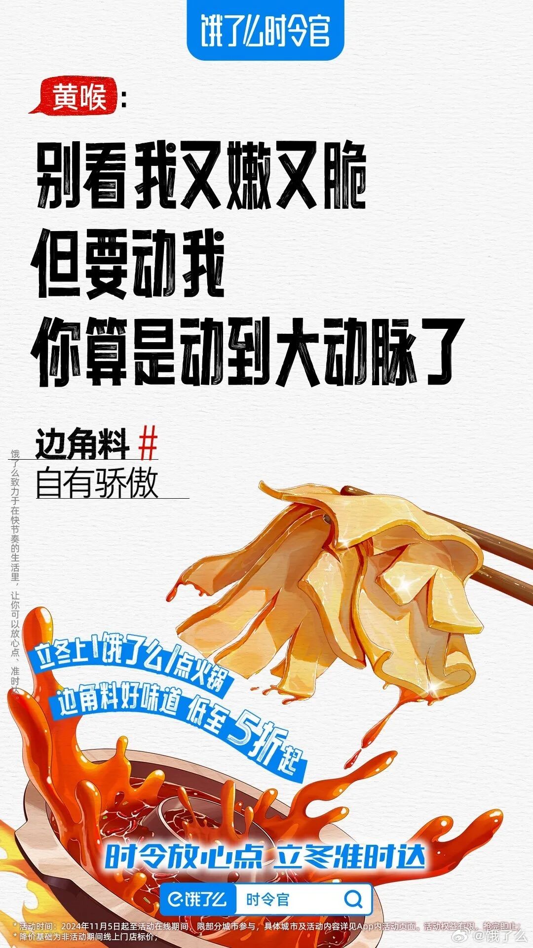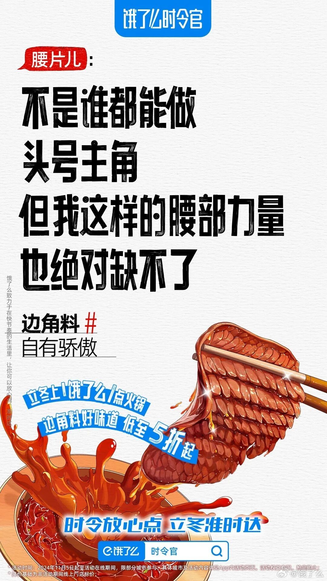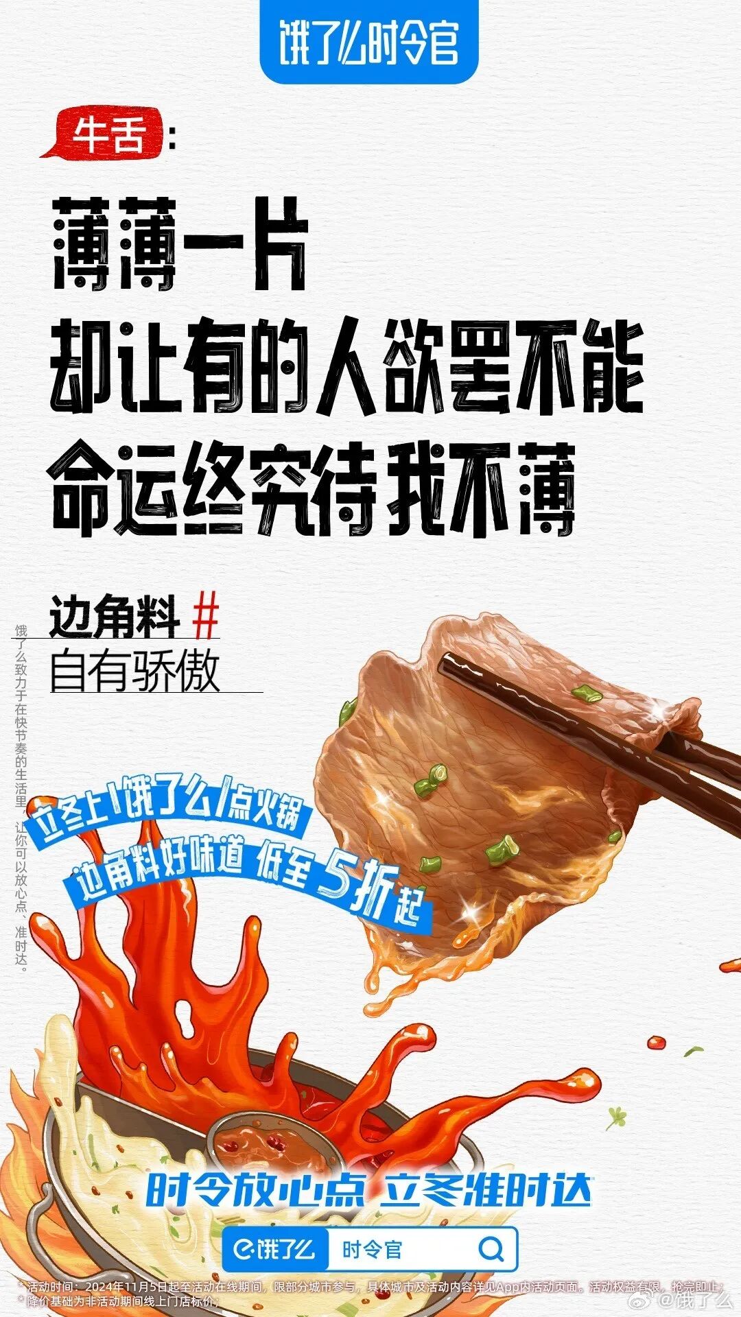 最近立冬,饿了么时令官写了一组以「边角料 自有骄傲」为主题的海报文案,让火锅边角料当主角自述,说出打工人心声。文案不仅和美食紧密挂钩,还十分励志。
