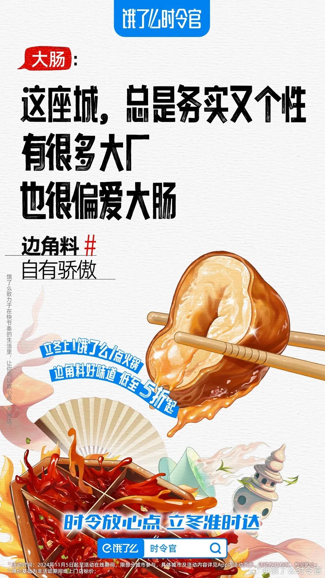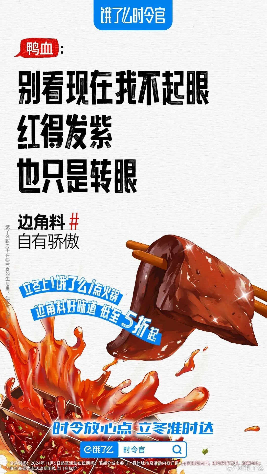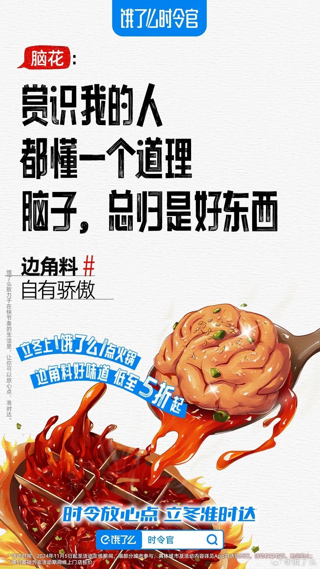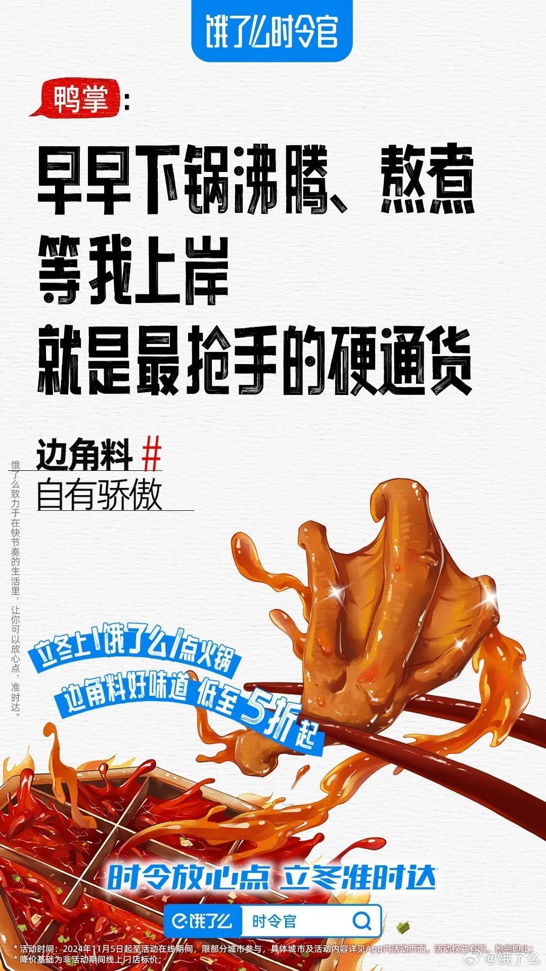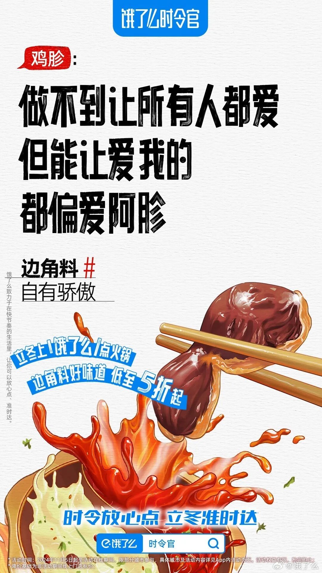 最近立冬,饿了么时令官写了一组以「边角料 自有骄傲」为主题的海报文案,让火锅边角料当主角自述,说出打工人心声。文案不仅和美食紧密挂钩,还十分励志。