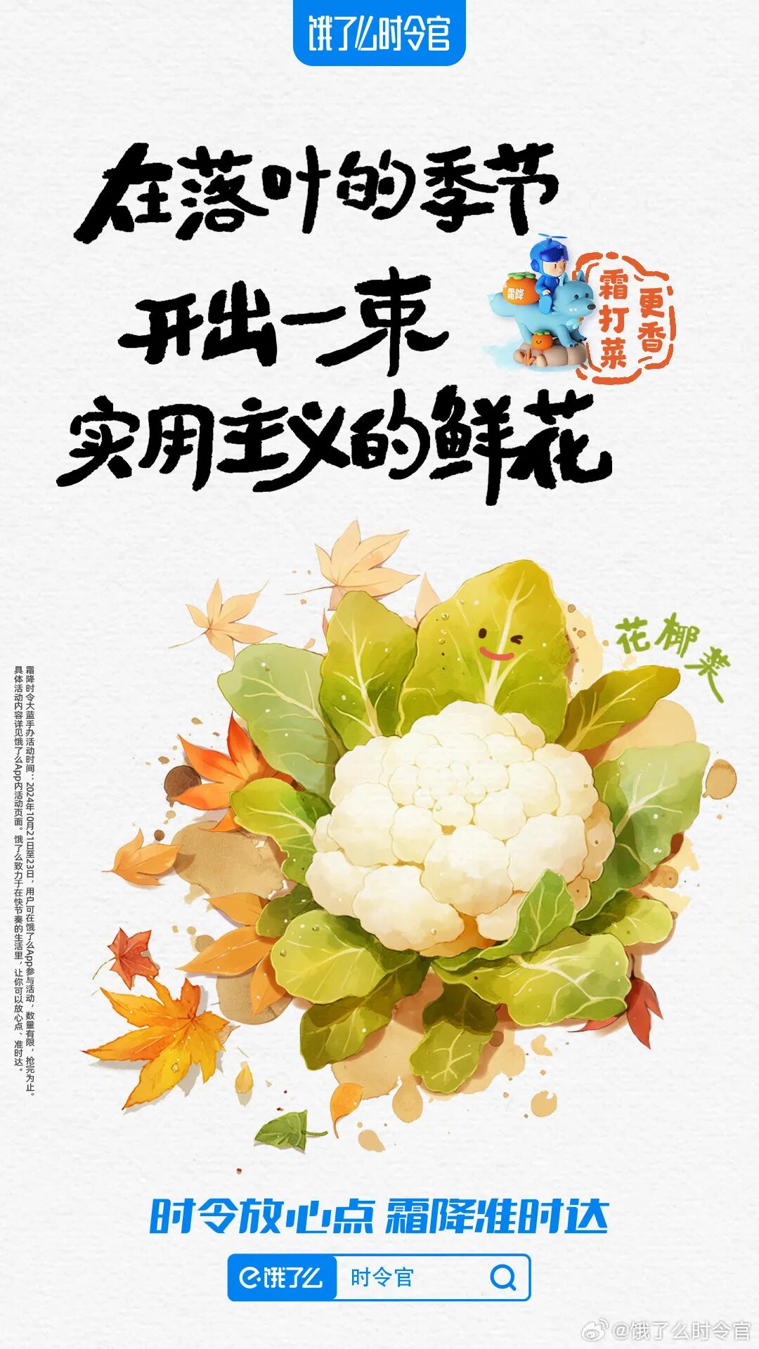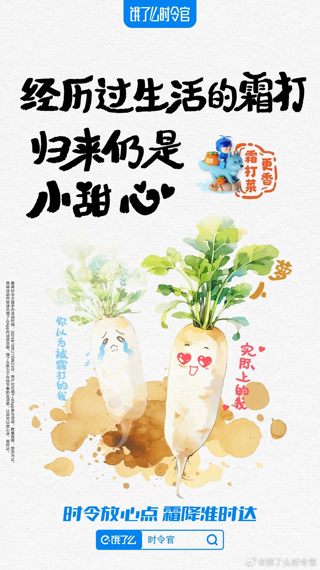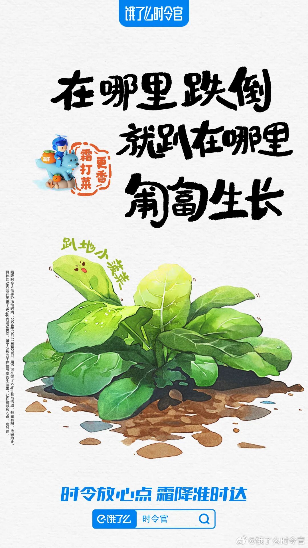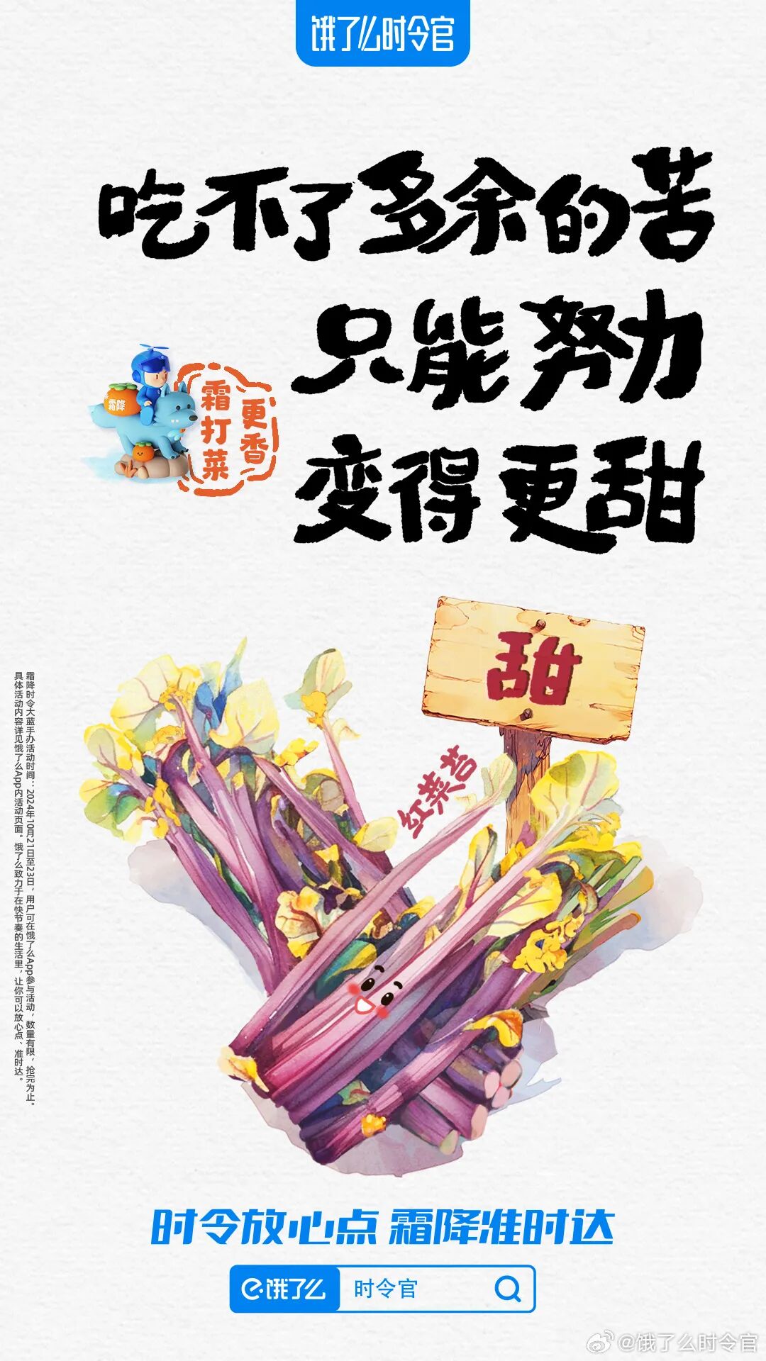 不仅有火锅边角料,饿了么还以蔬菜口吻写文案,十分有意思。在霜降时节,饿了么以霜打菜的口吻写了一组励志文案。