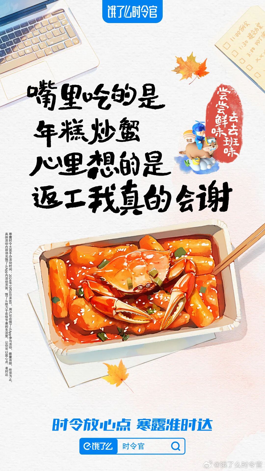 在寒露吃螃蟹的时节,饿了么以螃蟹的口吻替打工人发声。呼吁打工人尝尝鲜味,去去班味。