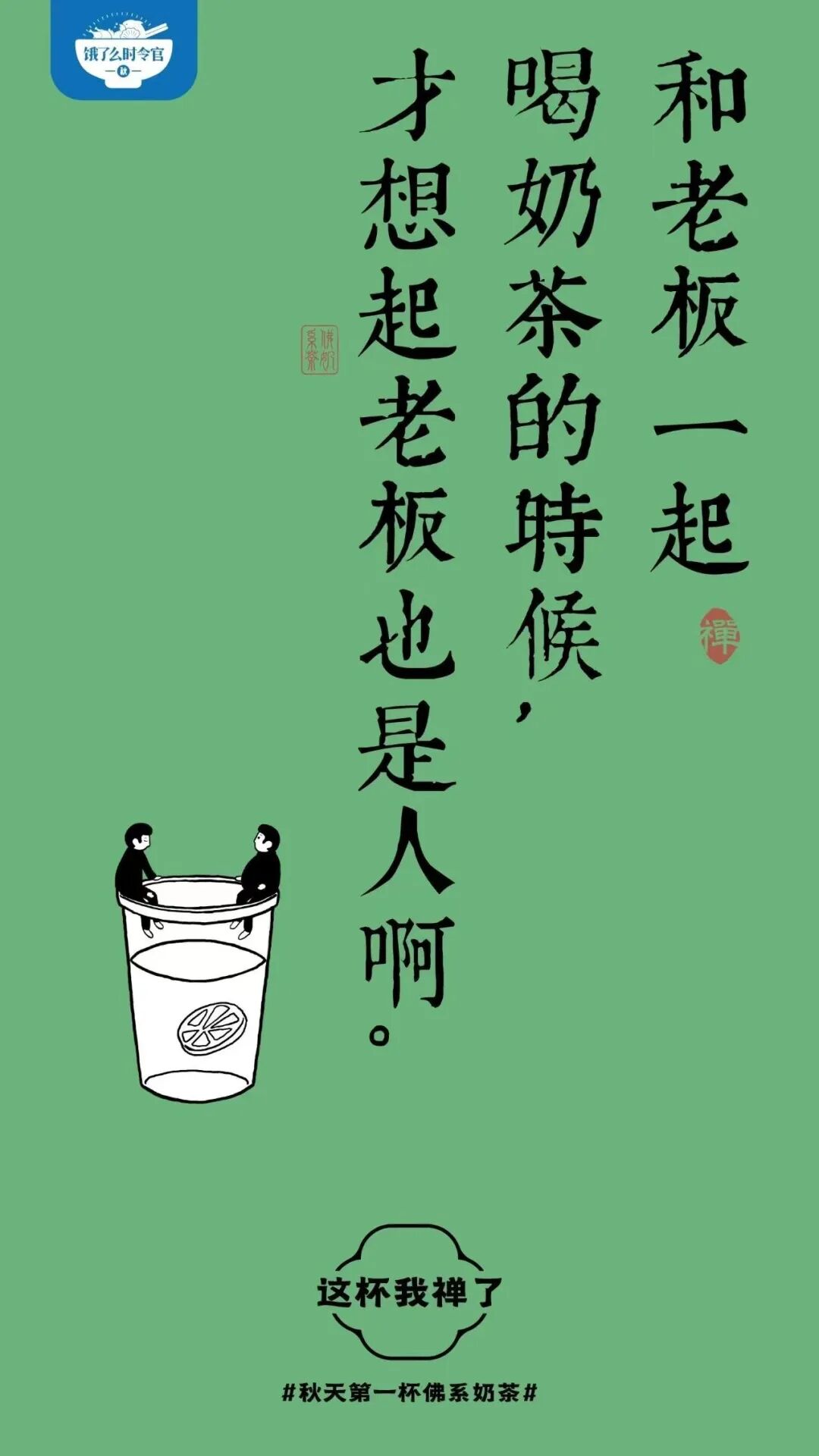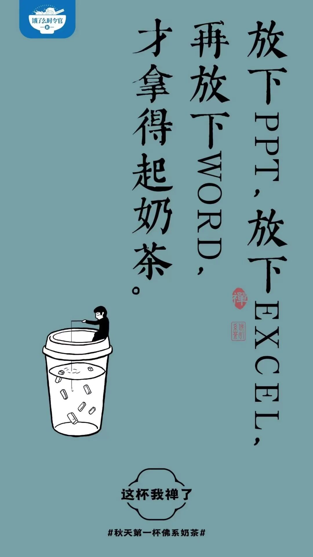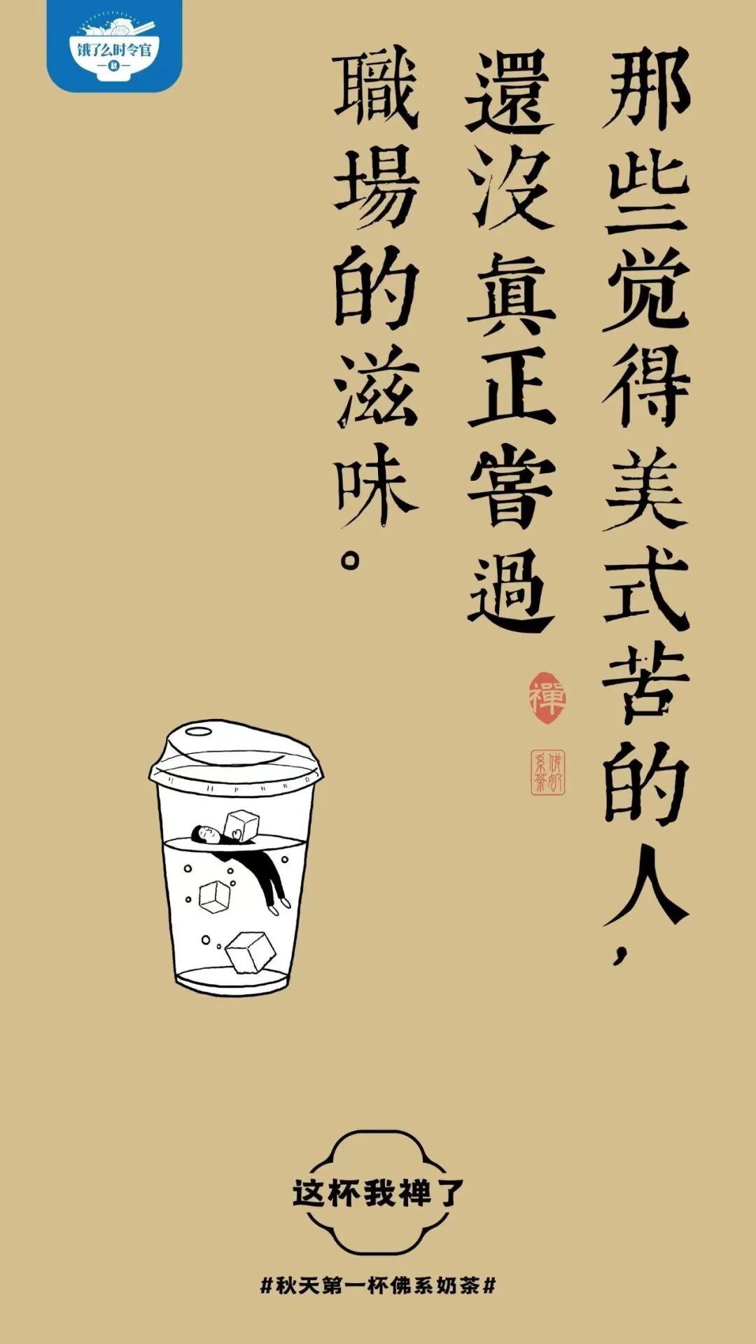 洞察年轻人的佛系文化,饿了么发起了“秋天第一杯佛系奶茶”公益活动,还写了一组佛系文案,说出打工人的佛系心声。