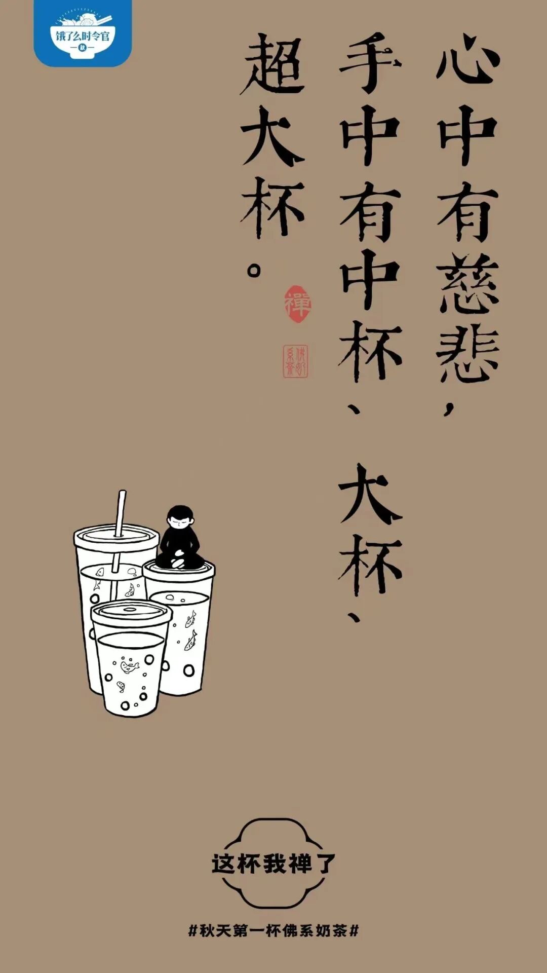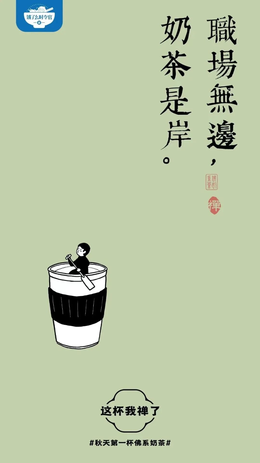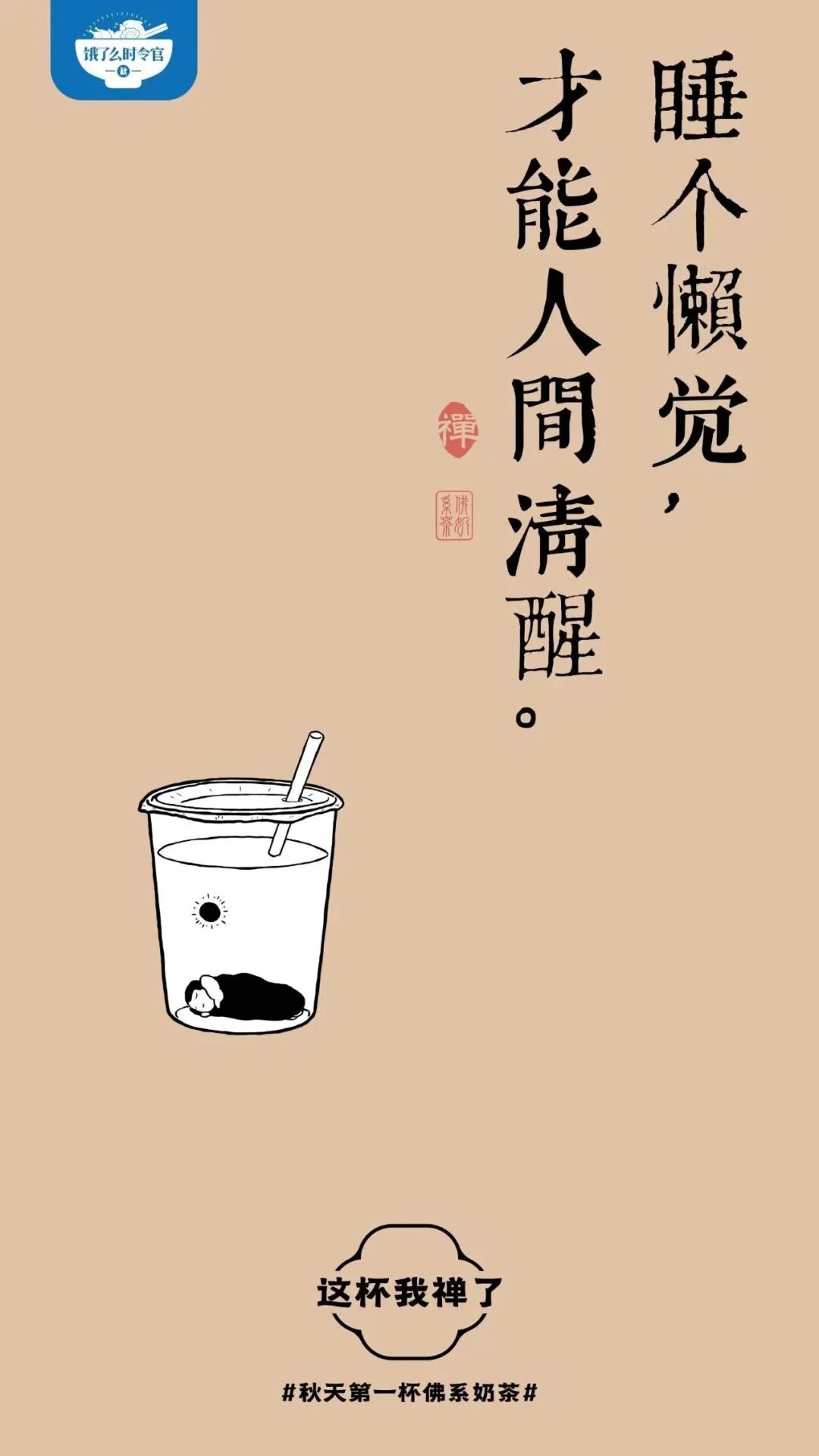 洞察年轻人的佛系文化,饿了么发起了“秋天第一杯佛系奶茶”公益活动,还写了一组佛系文案,说出打工人的佛系心声。
