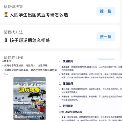 同样是搜索“如何在威海过周末”,文心一言给出的攻略更详尽,不过抖音AI搜索在给出攻略后还附上一个威海两天一夜的攻略视频。