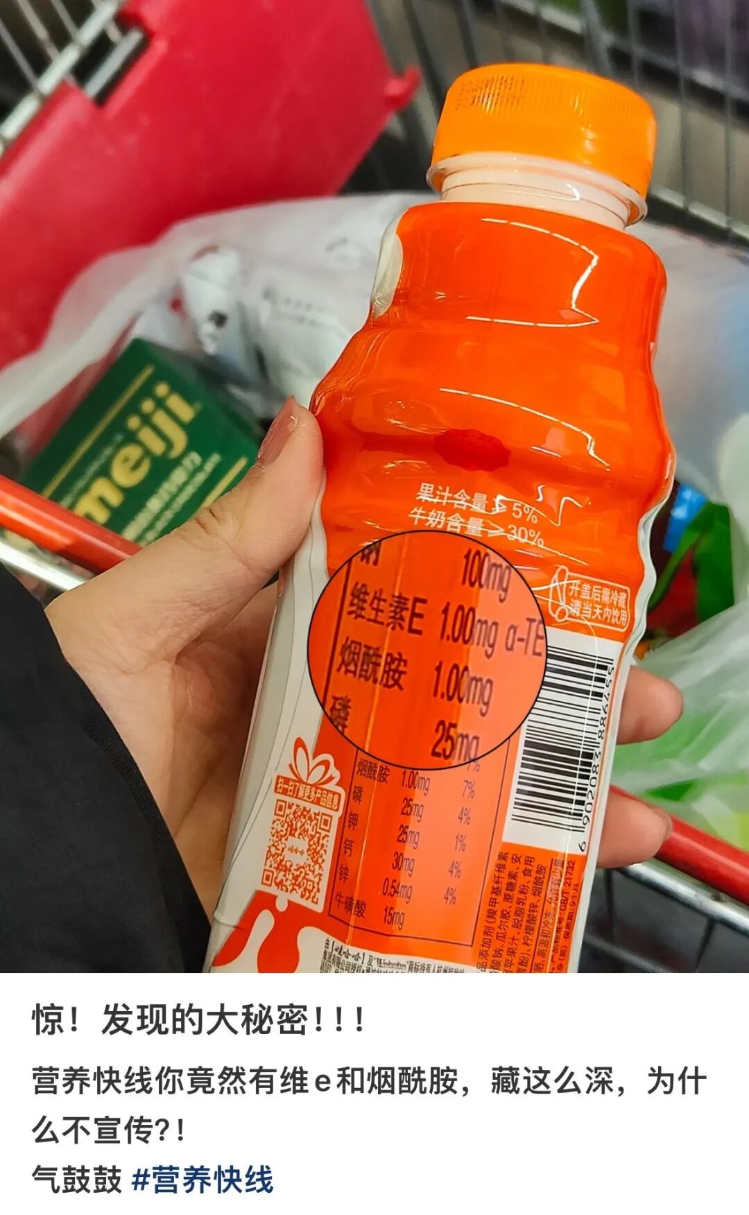 娃哈哈营养快线,由于添加了烟酰胺、牛磺酸,不仅和保健品划上了等号,还成为了“美少女快乐水”。
