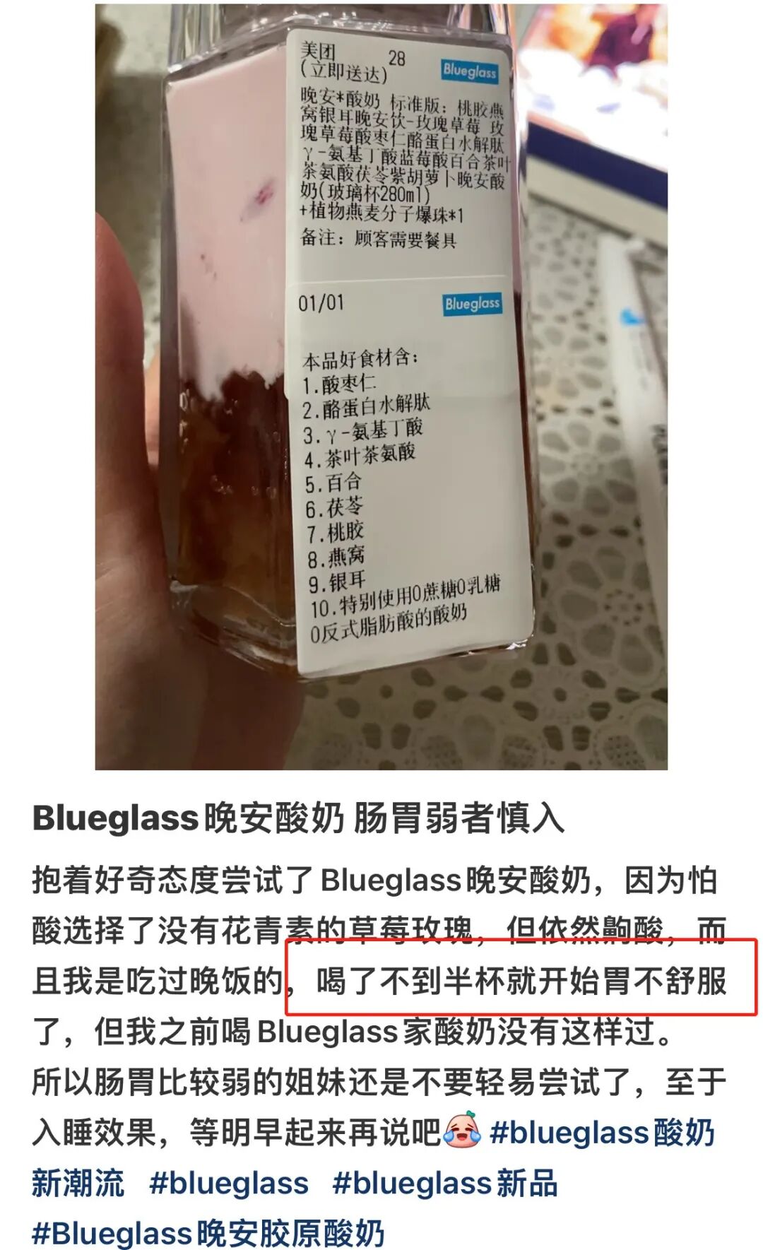 就说此次的“晚安胶原酸奶”,即使翻车为“泻药”,Blueglass也淡定得一批,因为它此前就曾经靠着“畅”出圈年轻人。