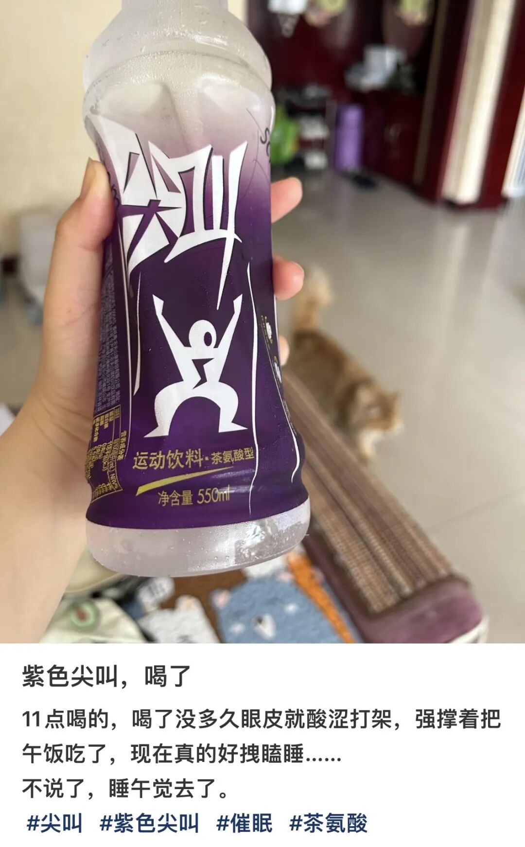 农夫山泉的紫色尖叫,由于添加了≥3mg的茶氨酸,同样被当成过“助眠神器”。