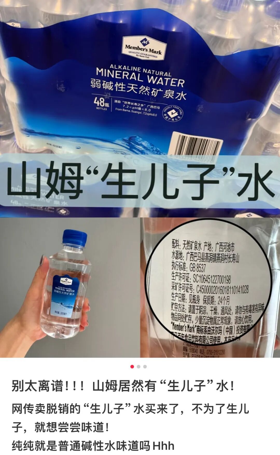 更离谱的是山姆的一款弱碱性天然矿泉水,由于正好吻合老一辈“碱性体质更易生儿子”的旧观念,被当成“生儿子水”被买爆了。