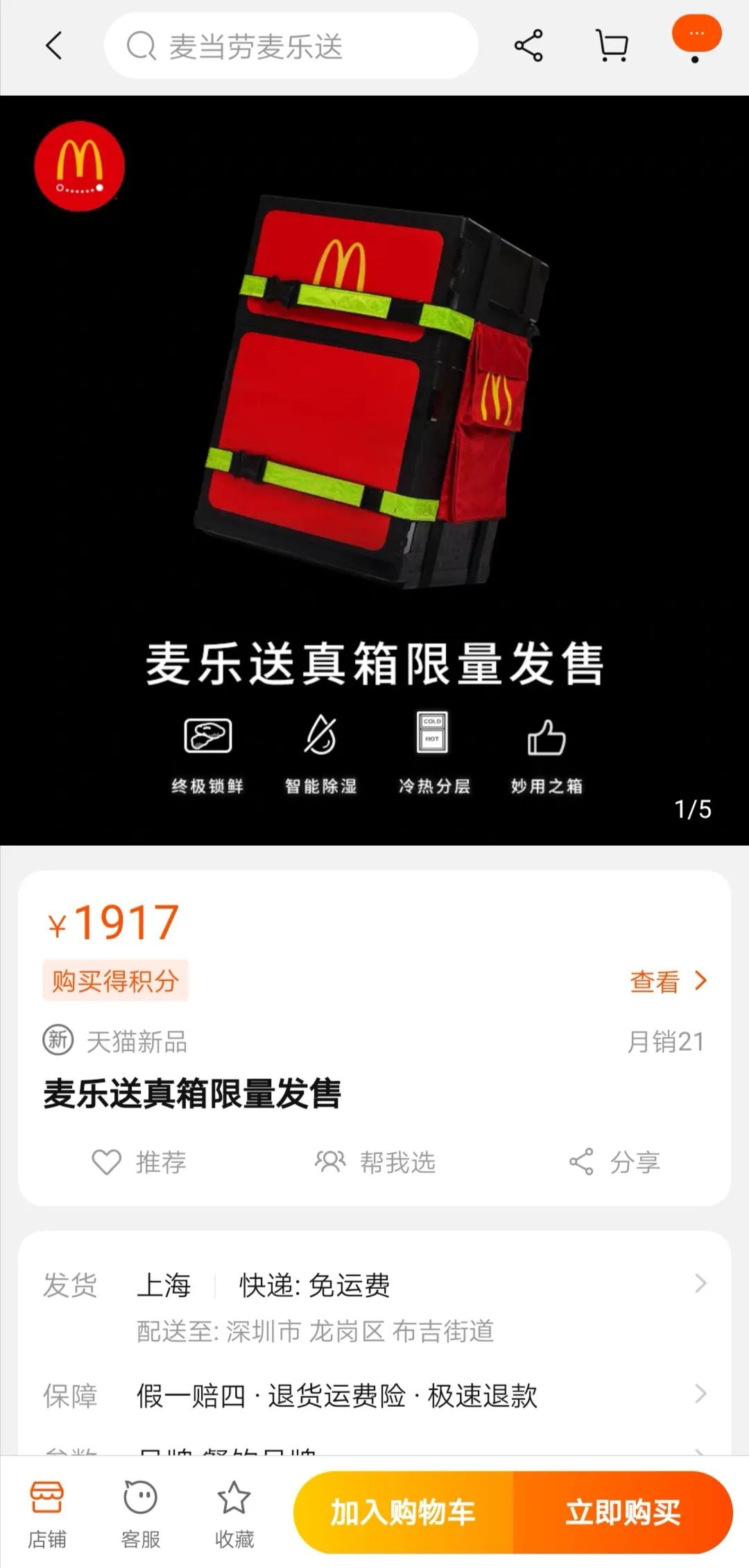 当时麦当劳还在电商平台,专门上线这款第二代外卖箱“麦乐送真箱限量发售”,定价高达1917元。