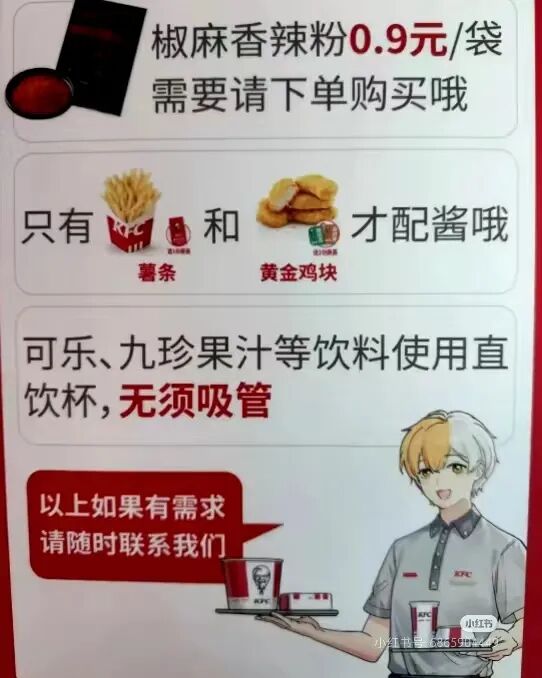 根据图片显示,肯德基提到只有“只有薯条和黄金鸡块”才配备酱料,可乐喝九珍果汁饮料使用直饮杯,无须吸管。