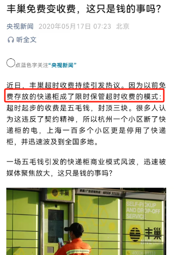 就看2020年4月,丰巢推出超时收费的政策,非会员用户超过12小时开始收费,超时后每12小时收费0.5元,3元封顶。而唯有付费会员才能享受超时收件服务,一时间巢快递柜成为了全网公敌。