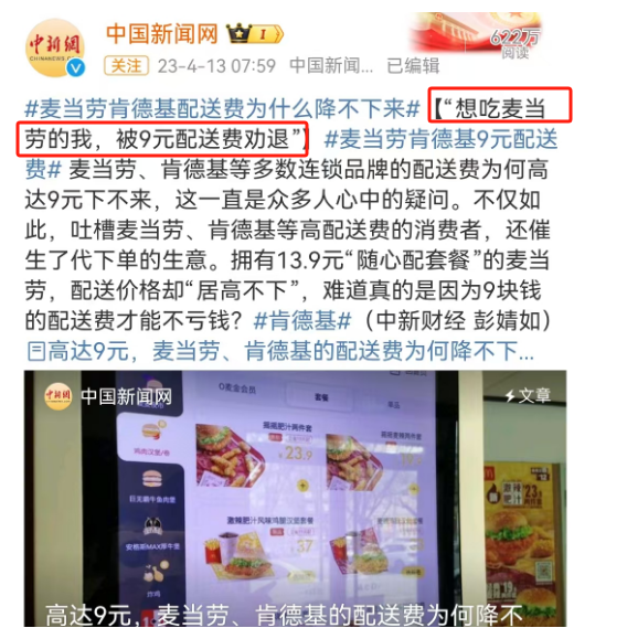 早在去年的时候“想吃麦当劳的我,被9元配送费劝退”话题登上热搜,暴露出消费者对于麦当劳们配送费居高不下的难评。