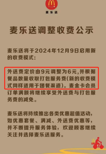具体来看,外送费定价由9元调整为6元,并根据餐品数量收取打包服务费。