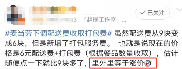 还是脱裤子放屁,有人算了笔账,配送费+打包费可能还大于9,属于变相涨价。