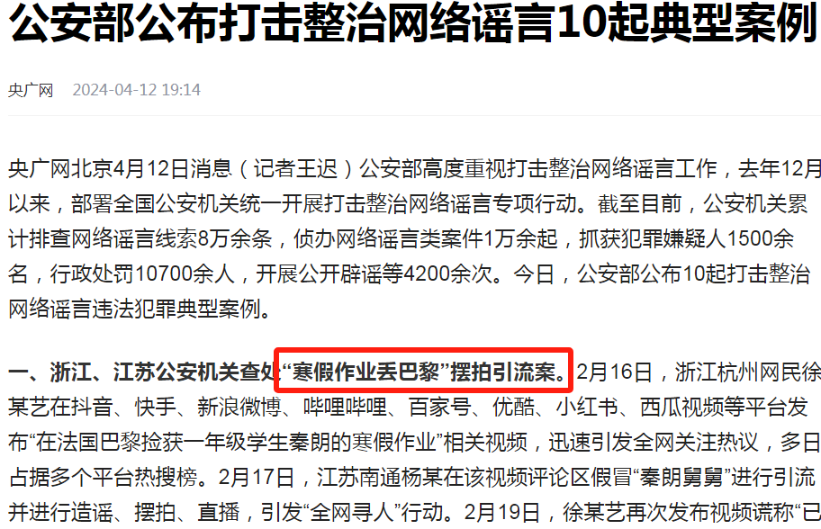 此前,据央广网报道:公安部公布了10起打击整治网络谣言违法犯罪典型案例。