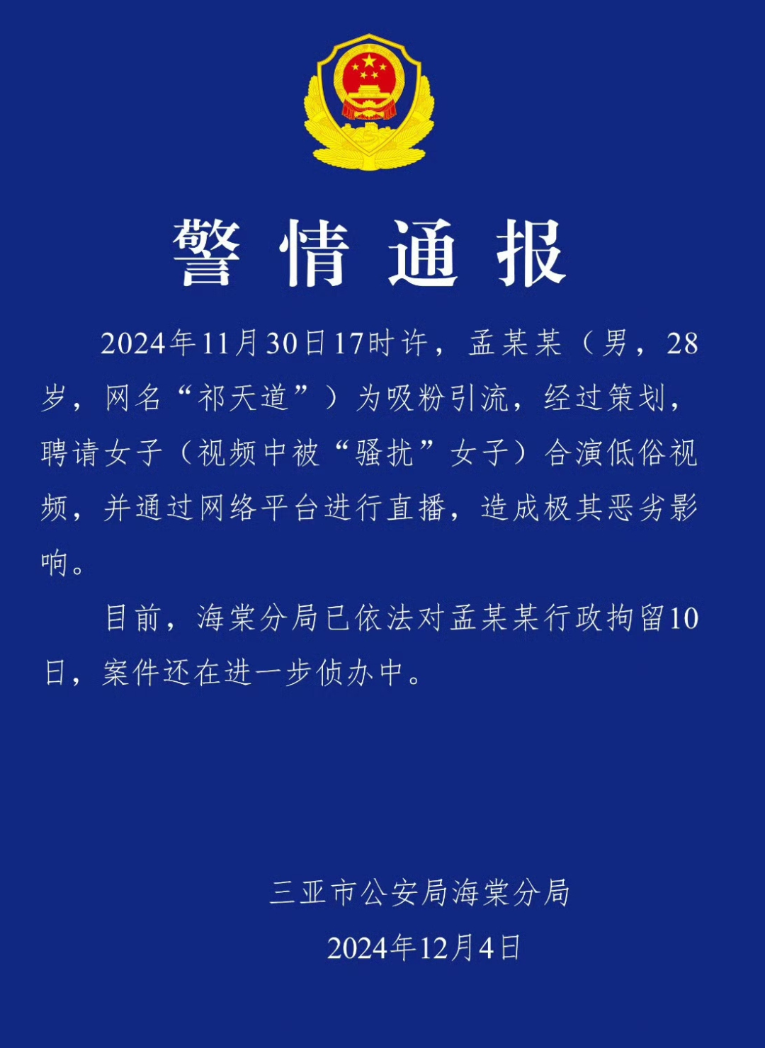 昨晚(12月4日),海南三亚警方发布通报称,2024年11月30日17时许,孟某某(男,28岁,网名“祁天道”)为吸粉引流,经过策划,聘请女子(视频中被“骚扰”女子)合演低俗视频,并通过网络平台进行直播,造成极其恶劣影响。