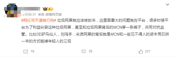 就有网友表示:垃圾网黑就应该被封杀,这里面最大的问题就在平台,很多时候平台为了利益纵容这种垃圾网黑,甚至和垃圾网黑背后的MCN穿一条裤子,共同对抗监管。