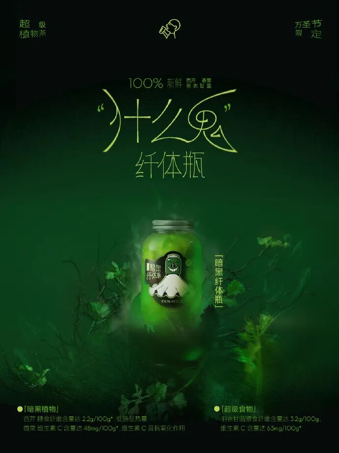 今年万圣节,喜茶还将两大“植物怪人”香菜和西芹与羽衣甘蓝融合,推出了“暗黑纤体瓶”,真的是随机吓死一个“讨厌香菜党”。