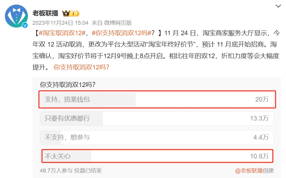 比如,在老板联播发起的“你支持取消双12吗?”投票中,有高达20万票投了“支持”,另外还有近11万票表示“不关心”!不支持取消的,仅有4.4万票。