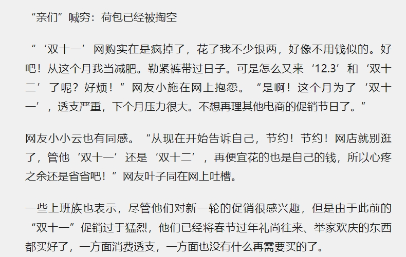 以今年为例,双11结束后,各大社交平台上,与双12相关的话题少之又少,大家对双12的议论甚至吐槽都鲜少见诸报端。