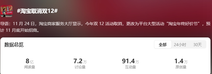 很快,“淘宝取消双12”火速登顶热搜,阅读量高达8亿,引发全网轰动。