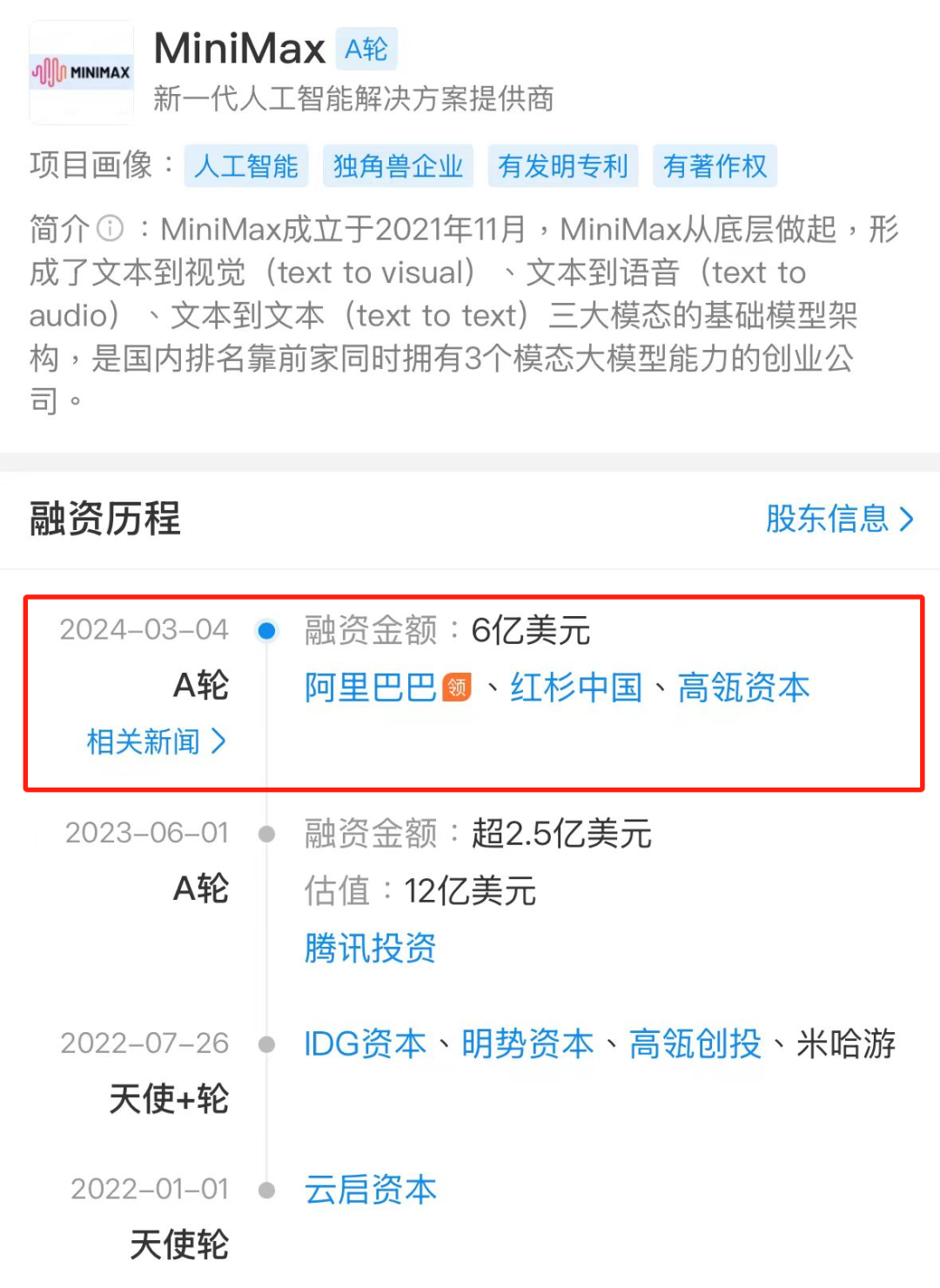 而在今年3月,在通用大模型初创公司MiniMax的融资环节当中,阿里巴巴就作为核心领投方,另外红杉中国和高瓴投资作为跟投,共计拟融资达到6亿美元。
