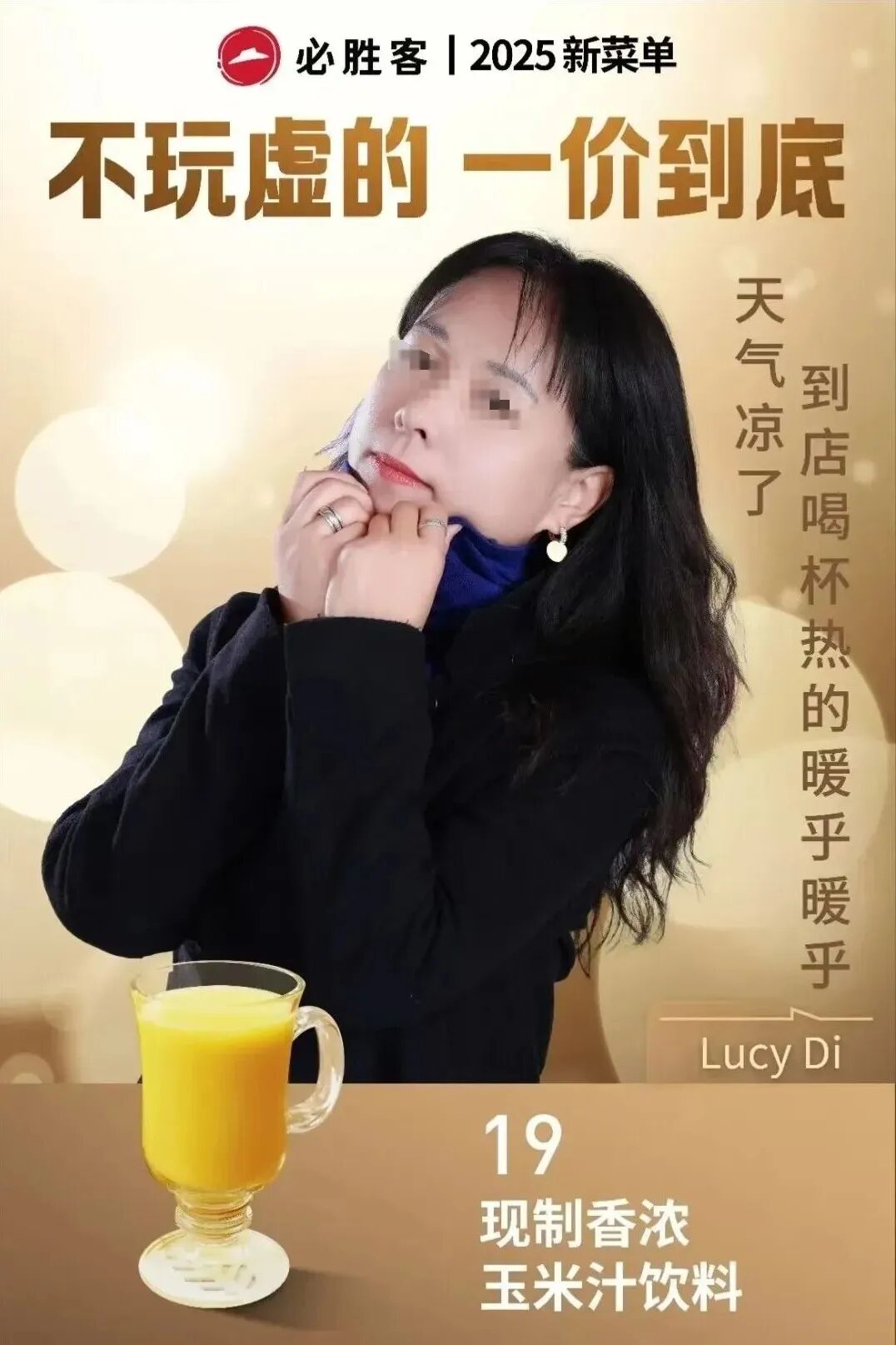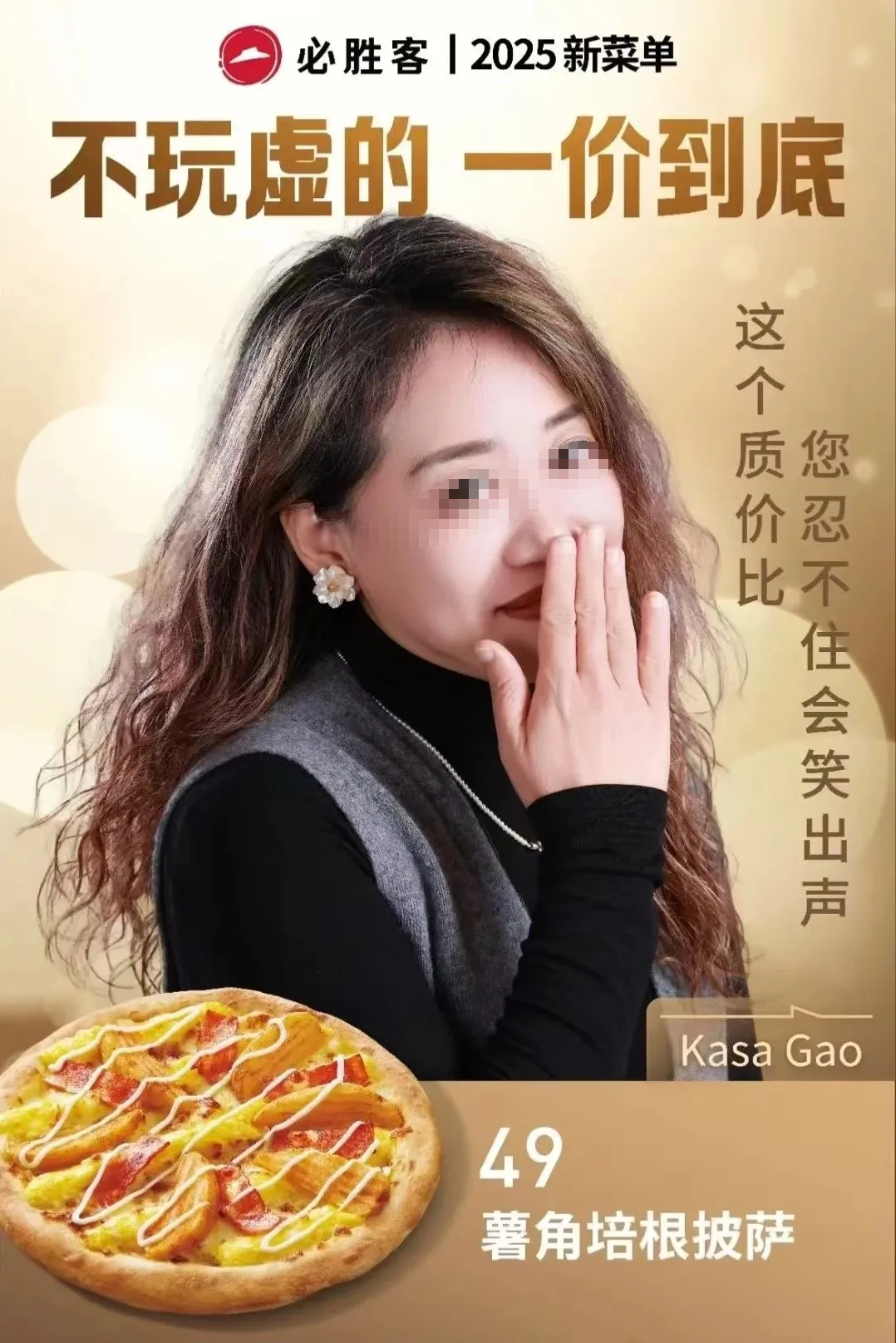 必胜客邀请高管真人出镜宣传新菜单,让员工为品牌代言,拍出了一种上交工作证图片,潦草抠图做海报的既视感。