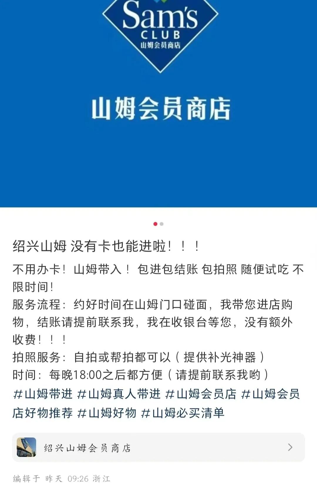 社交媒体上,不少帖子打出“绍兴山姆体验卡”的噱头,声称无需等待丝滑进入,还提供辅助拍照、商品介绍、结账等功能。