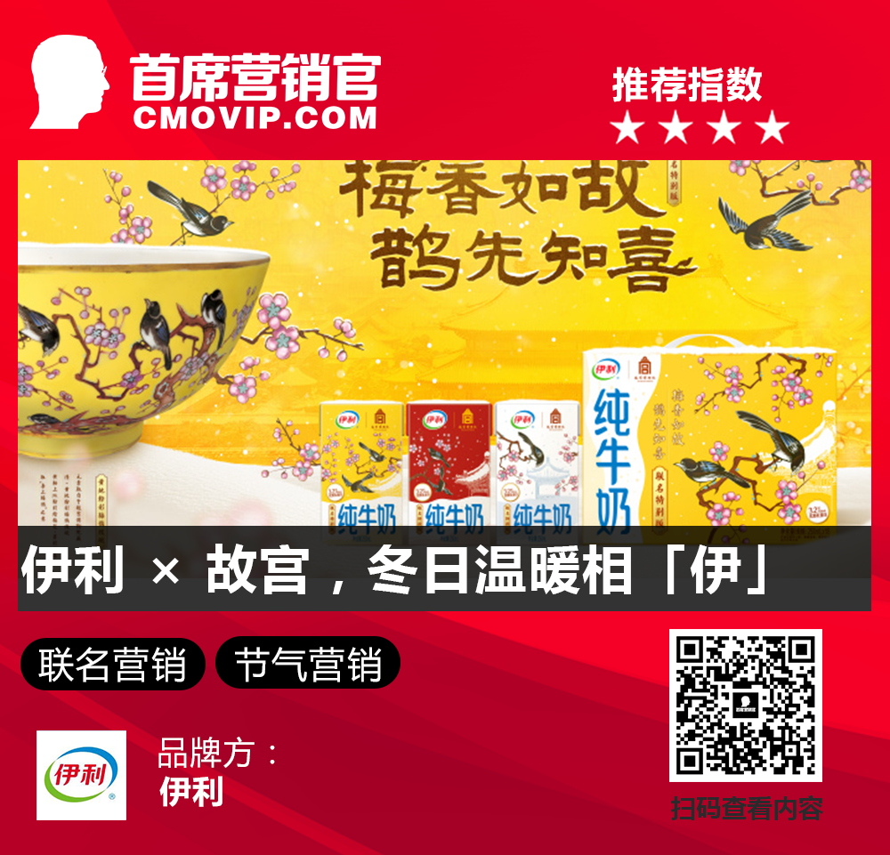 当国民品牌遇见故宫,伊利用一杯牛奶联结故宫传统文化与现代生活日常,用一碗喜悦传递“喜上眉梢”之意。