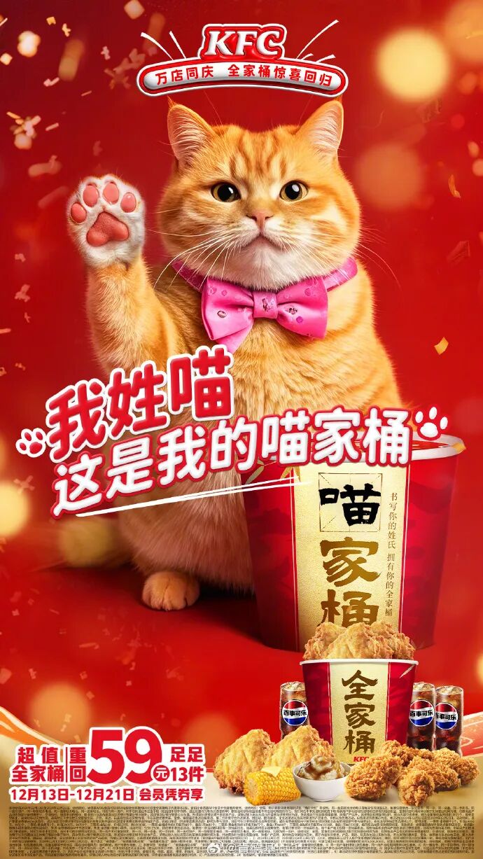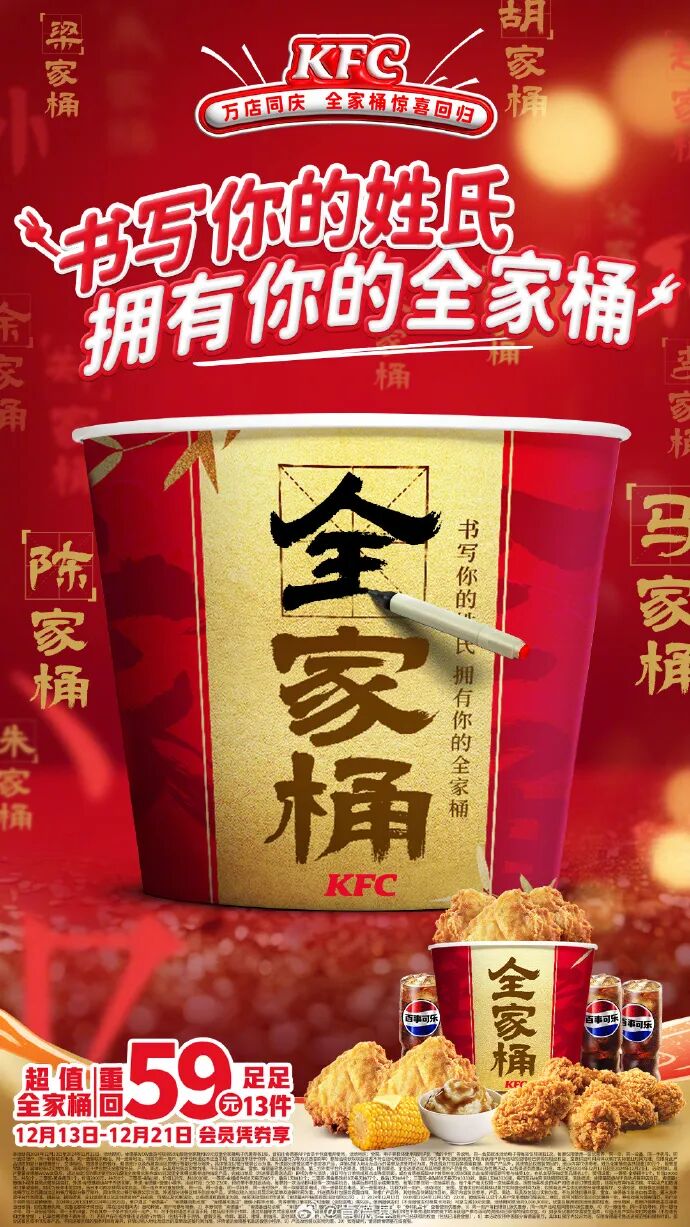 最近肯德基为了宣传全家桶价格重归59元(59元13件),推出“姓氏桶”活动,邀请大家“书写你的姓氏,拥有你的全家桶”。