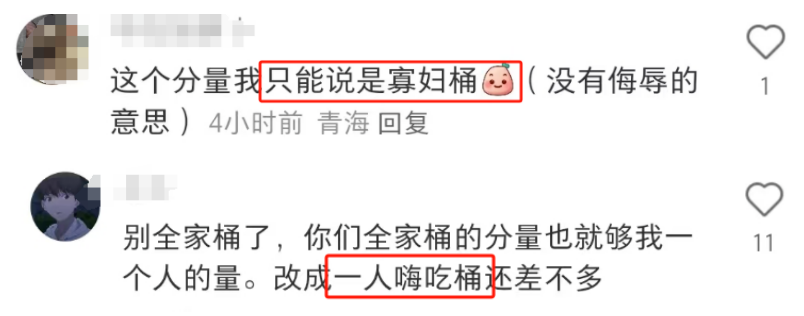 虽然这次肯德基全家桶59元,包含原味鸡、辣翅等13件小吃,但还是招来“一个人吃的全家桶”以及“寡妇桶”的评价。