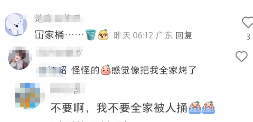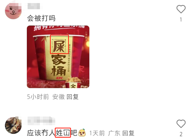 因为不是所有姓氏都跟全家桶很配,比如有人联想到“全家捅”,还有的想到“冚家桶”(冚家铲:广东有诅咒全家之意)和“烤全家”。