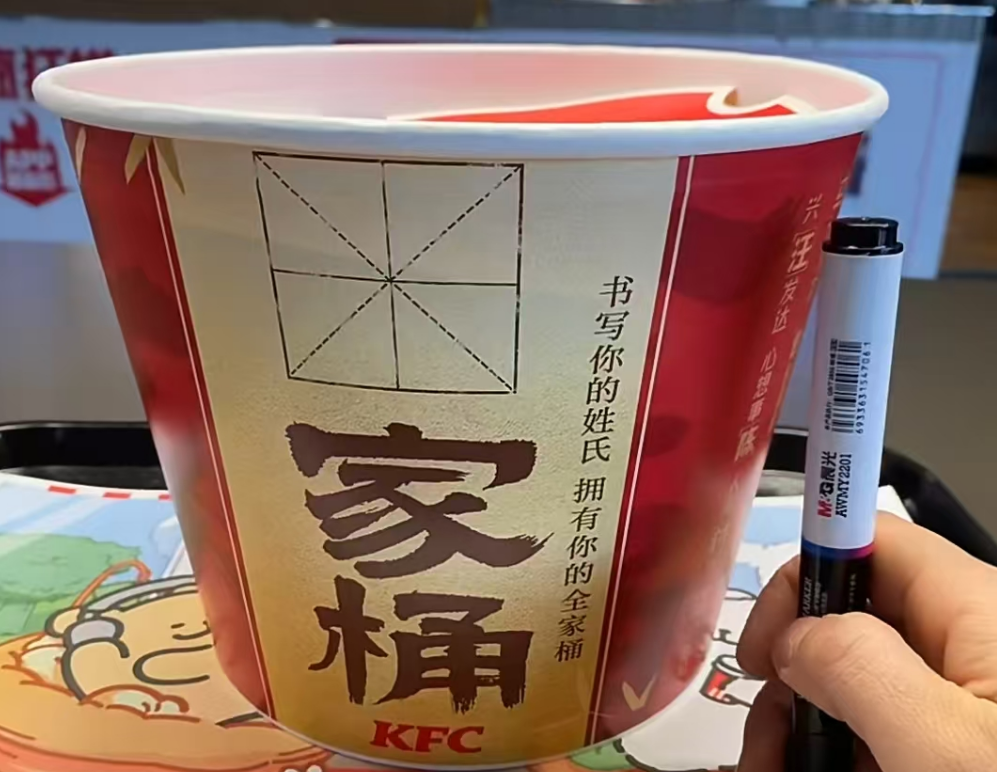 简单来说,肯德基把桶的“全”字去掉了,然后让大家自己动手写上自己的姓氏,变成自己的全家桶。