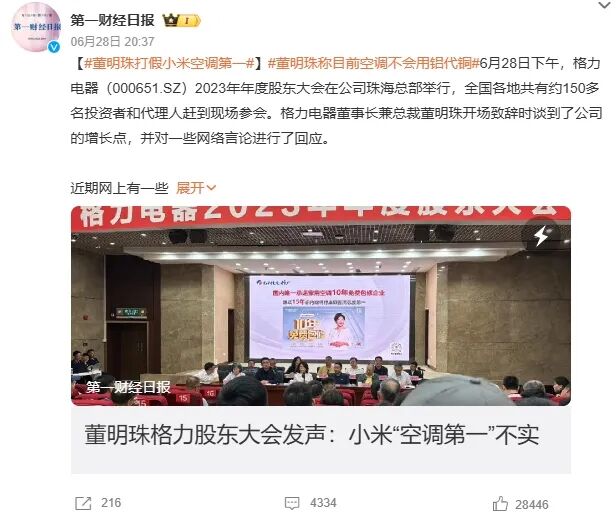 格力电器 2023 年度股东大会上,董小姐毫不客气地将矛头指向小米:“最近网上谣言泛滥,小米(空调)居然敢称自己是第一,全靠厂家做产品,它到底有啥技术?谁是第一,消费者心里自有一杆秤!”