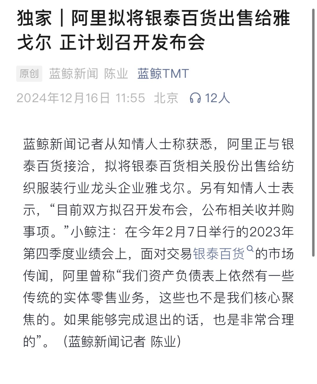 昨天(12月16日),蓝鲸新闻报道称,阿里正与银泰百货接洽,拟将银泰百货相关股份出售给纺织服装行业龙头企业雅戈尔。