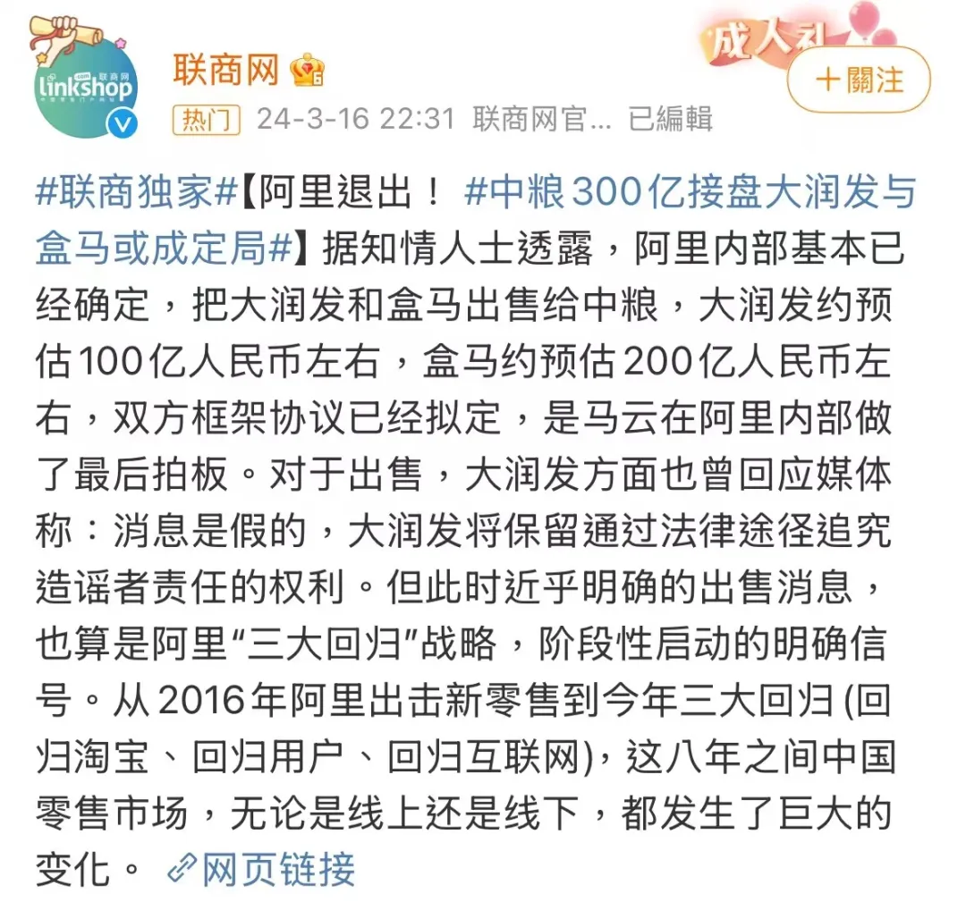 今年3月,就有消息称,阿里将盒马和大润发以300亿人民币的价格出售给中粮集团,而大润发公关部门则迅速否认了这一说法。