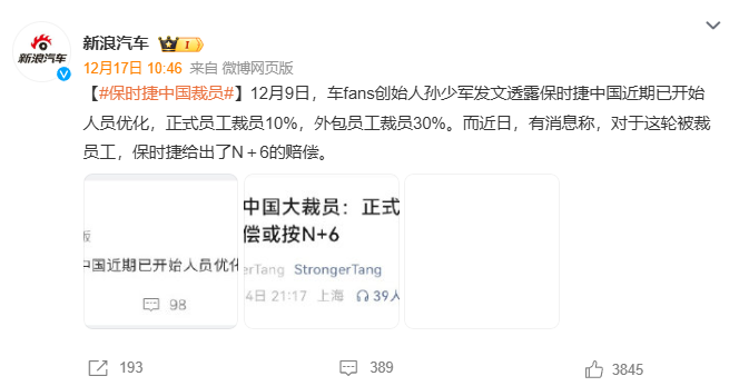 两天前,保时捷“裁员30%,赔偿标准N+6”的传闻掀起轩然大波。
