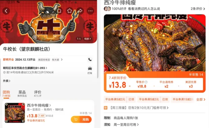 他新创立的“牛校长”现烤牛肉干店,其中一款名为“精选纯瘦西冷牛排”的商品,在美团平台上的最低价竟然只要13.8元。
