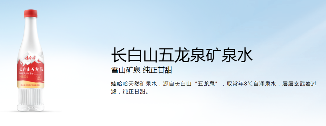 从2015年开始,农夫山泉就以长白山为水源推出了一系列产品,如玻璃瓶天然矿泉水、运动盖天然矿泉水、长白雪等。