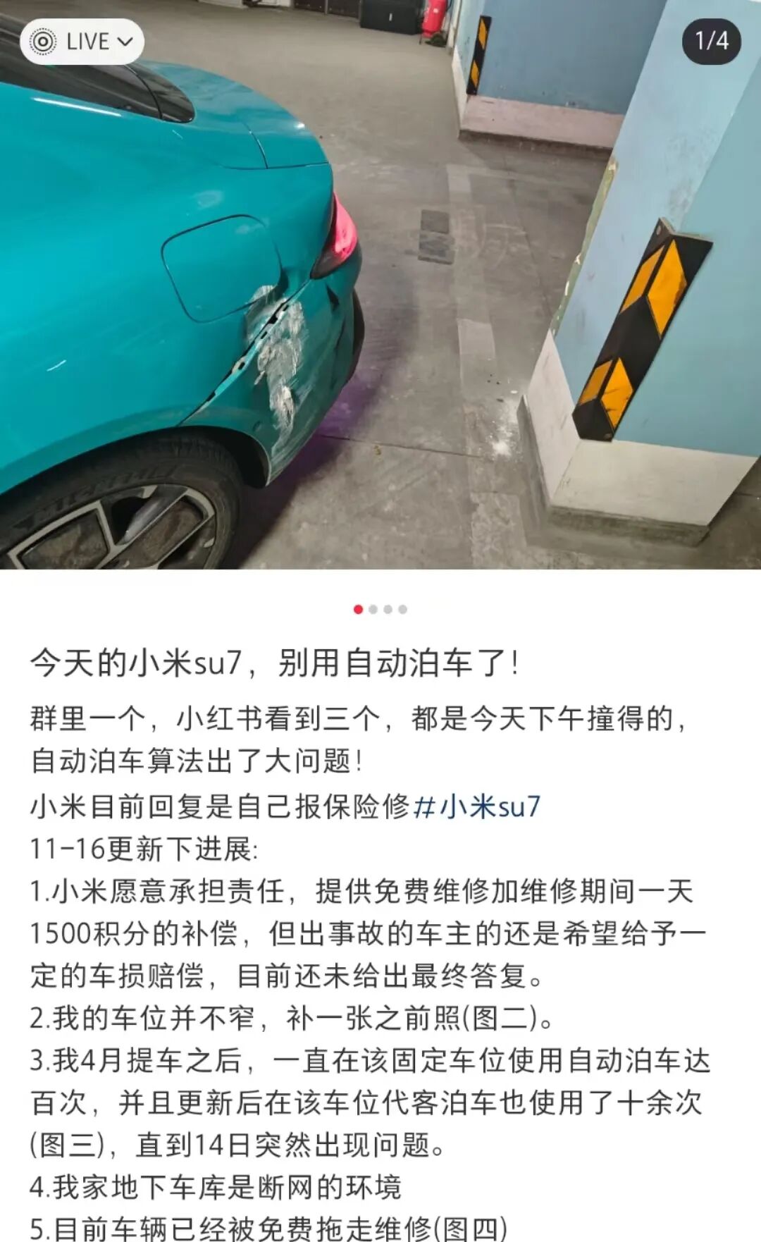 如一个月前,多位车主在社交媒体上晒出自己的SU7自动泊车功能出现异常,发生车辆失控及剐蹭现象。
