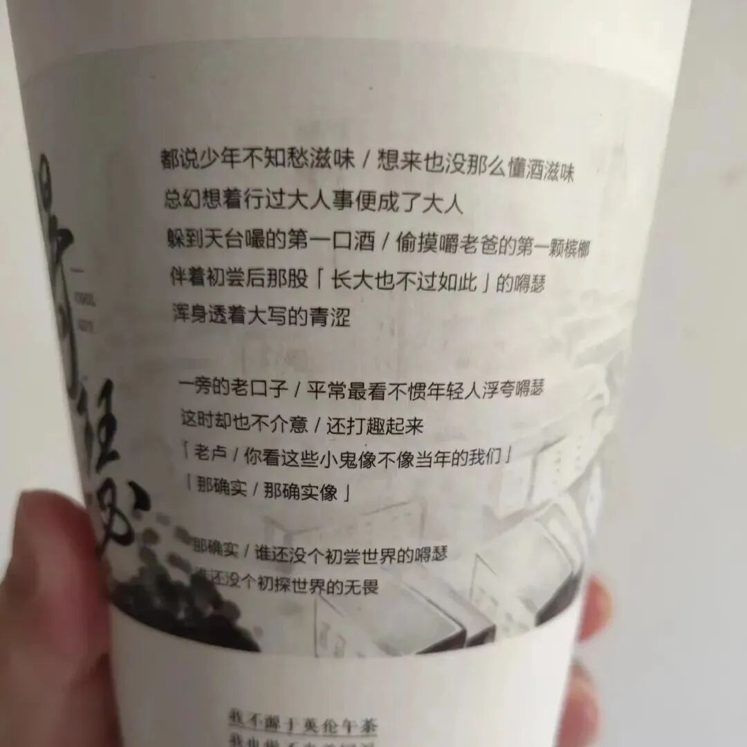 茶颜悦色的杯身文案,写的是青春年少,是向往的烟火人间,文案更是将学生时光与步入社会的生活进行对比,让人产生情感共鸣。