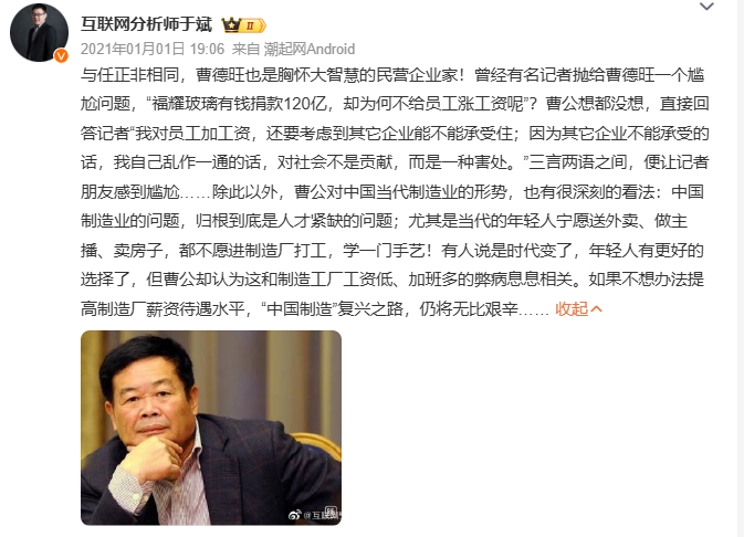 在多数打工人看来,提起老板满脑子都是那个阴险刻薄的恶霸地主形象。这是当下社会的一个真实缩影,从马云的“996福报”到曹德旺“宁愿捐出100亿,也不会给员工涨工资,因为高工资会让年轻人失去奋斗的动力”.....大众见惯了自我视角下的企业家“富而不能仁”,因而刘强东的出现俨然让无数人生出了深深的共情力。