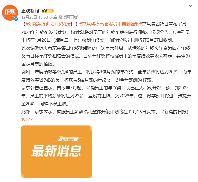 京东公告还显示,自今年7月起,采销员工的年终奖计划已正式启动升级,预计到2024年,员工的平均薪酬将达到23薪,且没有上限。到2026年,这一数字预计将进一步提升至26薪,同样不设上限。
