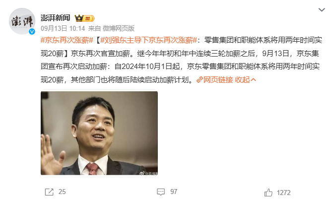 今年9月,继今年年初和年中连续三轮加薪之后,京东宣布,自2024年10月1日起,京东零售和职能体系将用两年时间实现20薪,其它部门也将随后陆续启动加薪计划。