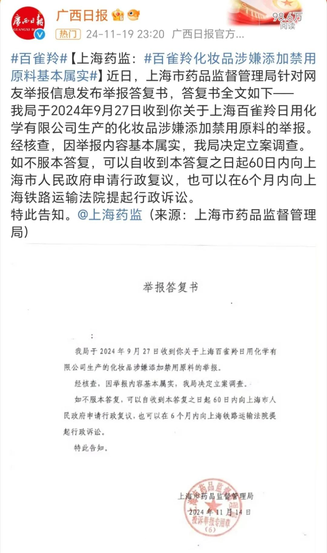 有网友爆料,百雀羚某款产品中违规添加“圆叶牵牛提取物”,还附上了上海药监局的《举报答复书》。